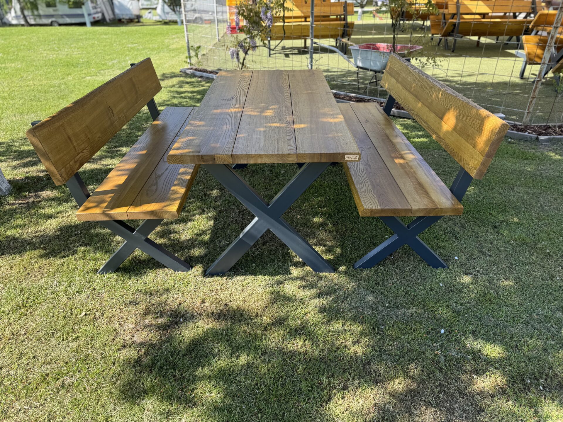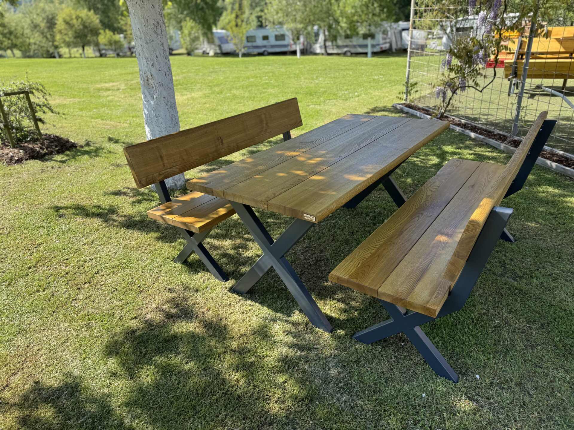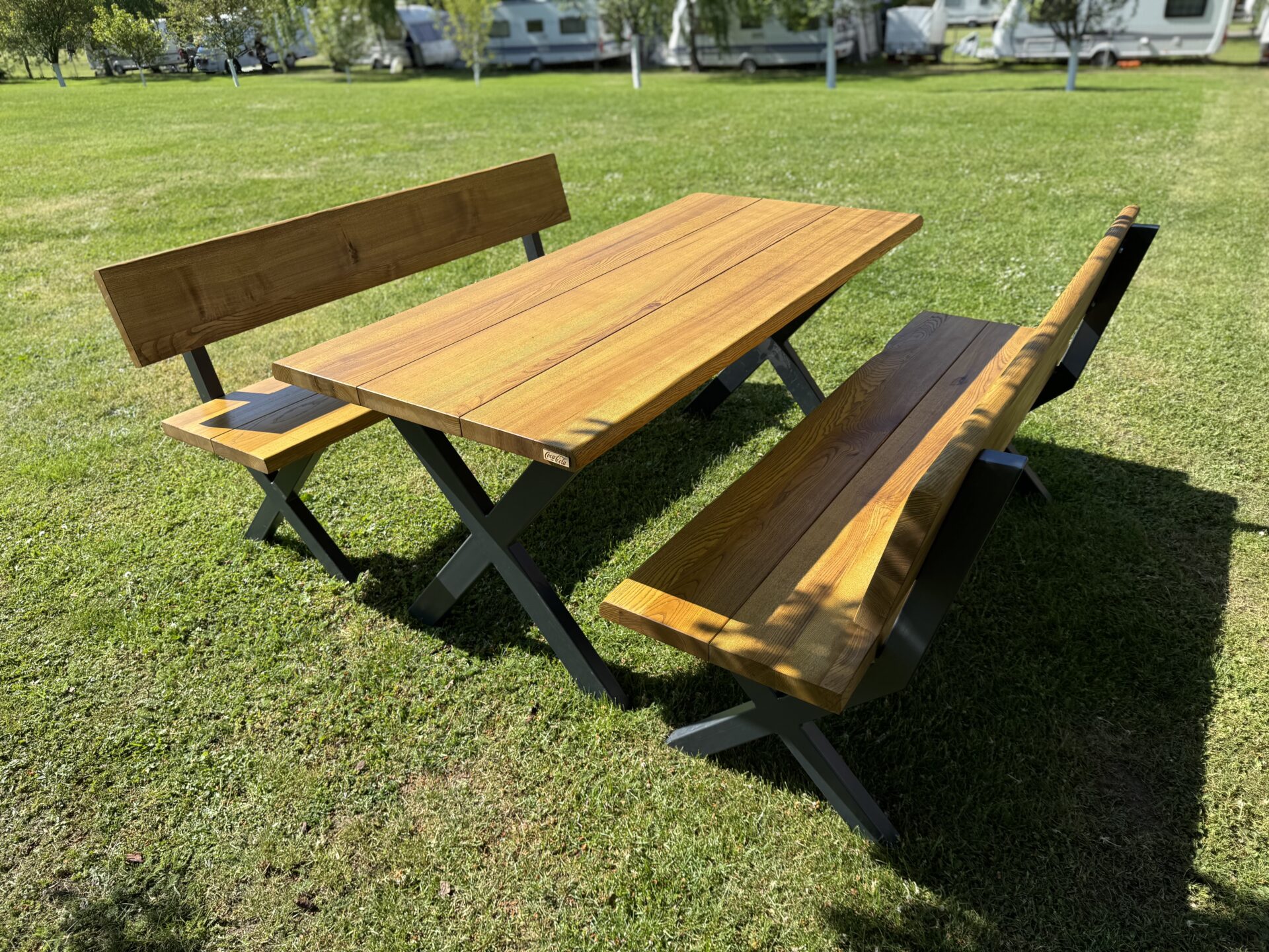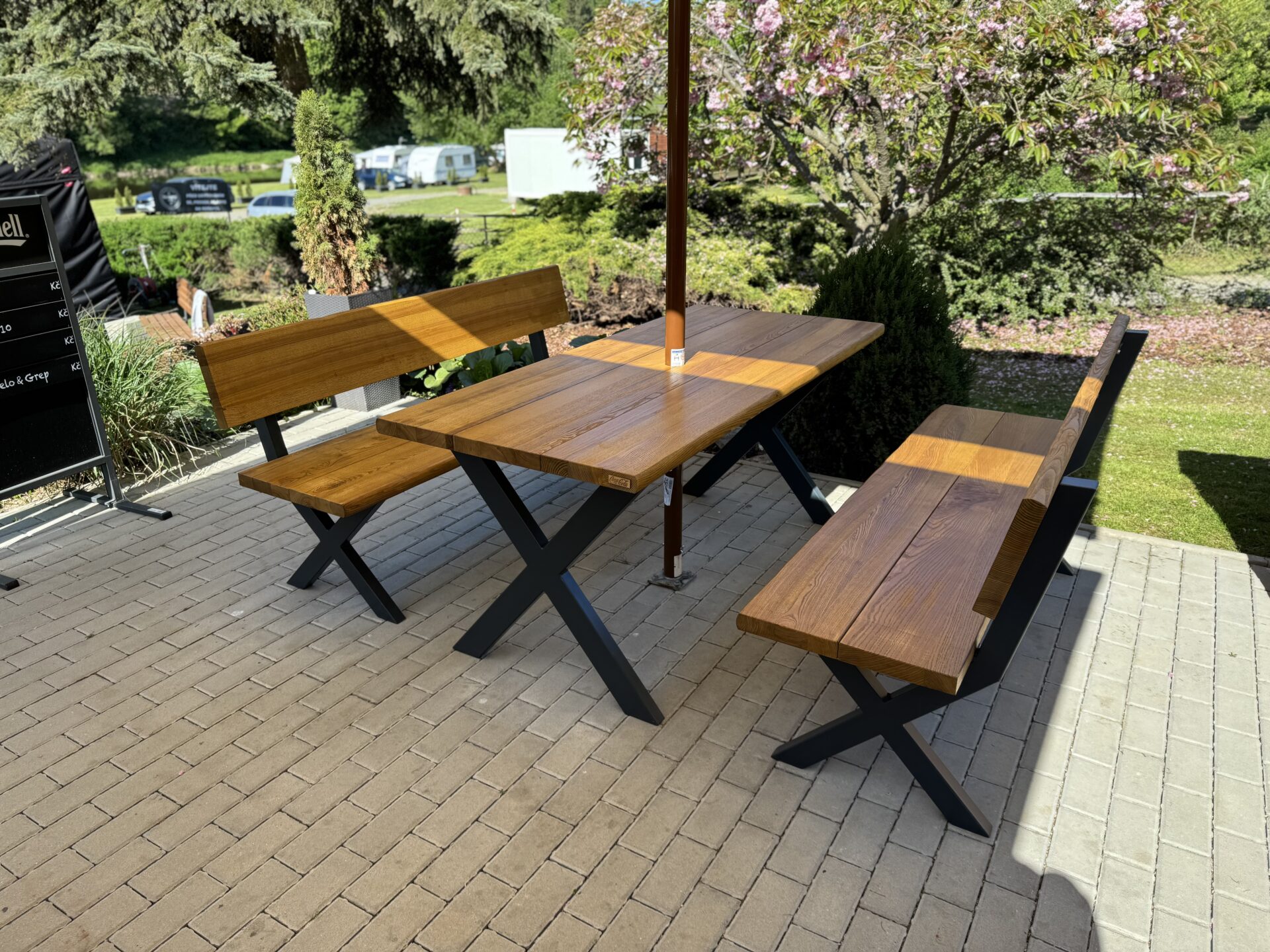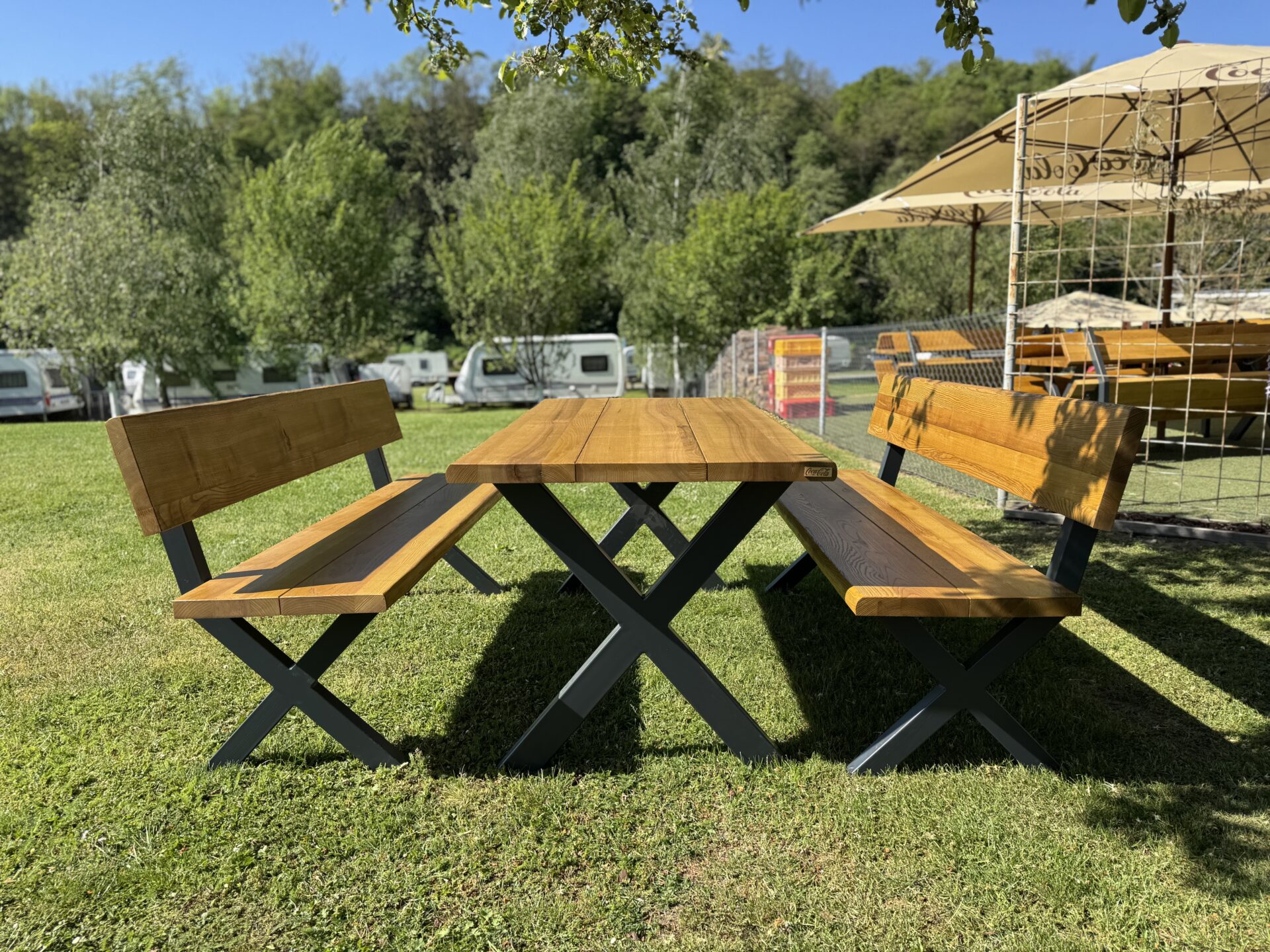 Název RIVIERA není náhodný – set vznikl jako součást zakázky pro nový kemp Riviera Zbečno, kam jsme dodali 15 těchto setů. Díky svému nadčasovému designu a odolnosti se skvěle hodí pro dlouhé provozy i soukromé terasy.