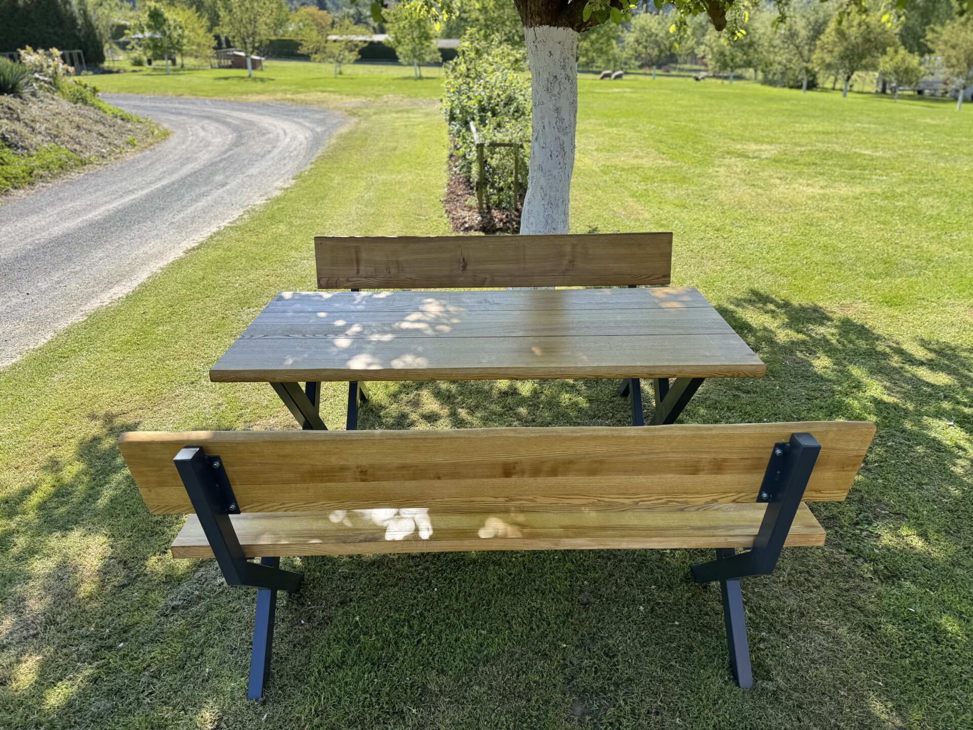 Set RIVIERA je stylový a odolný komplet zahrnující jeden stůl a dvě lavice, navržený tak, aby vydržel každodenní provoz a zároveň působil elegantně. Stůl je složen ze tří pevných kusů masivu, spojených truhlářskými kolíky Festool DOMINO pro maximální stabilitu a dlouhou životnost. Lavice mají sedák ze dvou samostatných dílů a opěradlo z jednoho kusu dřeva, což podtrhuje jejich jednoduchý a čistý vzhled.